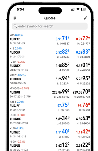 The Quotes section in MT5 displays real-time bid and ask prices, spreads, highs, lows, and time updates for each trading instrument.